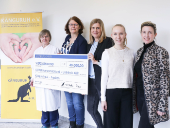 KÄNGURUH e. V., der Verein zur Förderung der Frühgeborenen-Station und des Perinatalzentrums an der Uniklinik Köln, hat dem Centrum für Familiengesundheit (CEFAM) kurz vor Weihnachten einen Spendenscheck in Höhe von 40.000 Euro für den Aufbau einer Humanmilchbank übergeben. Das Geld wird zur Anschaffung von speziellen Kühlschränken und Tiefkühlern für die technische Ausstattung genutzt, die für die Lagerung der Muttermilch notwendig sind. Mit dieser großzügigen, selbst initiierten Spende leistet der Verein einen bedeutenden Beitrag zur bestmöglichen Versorgung von Früh- und Neugeborenen.